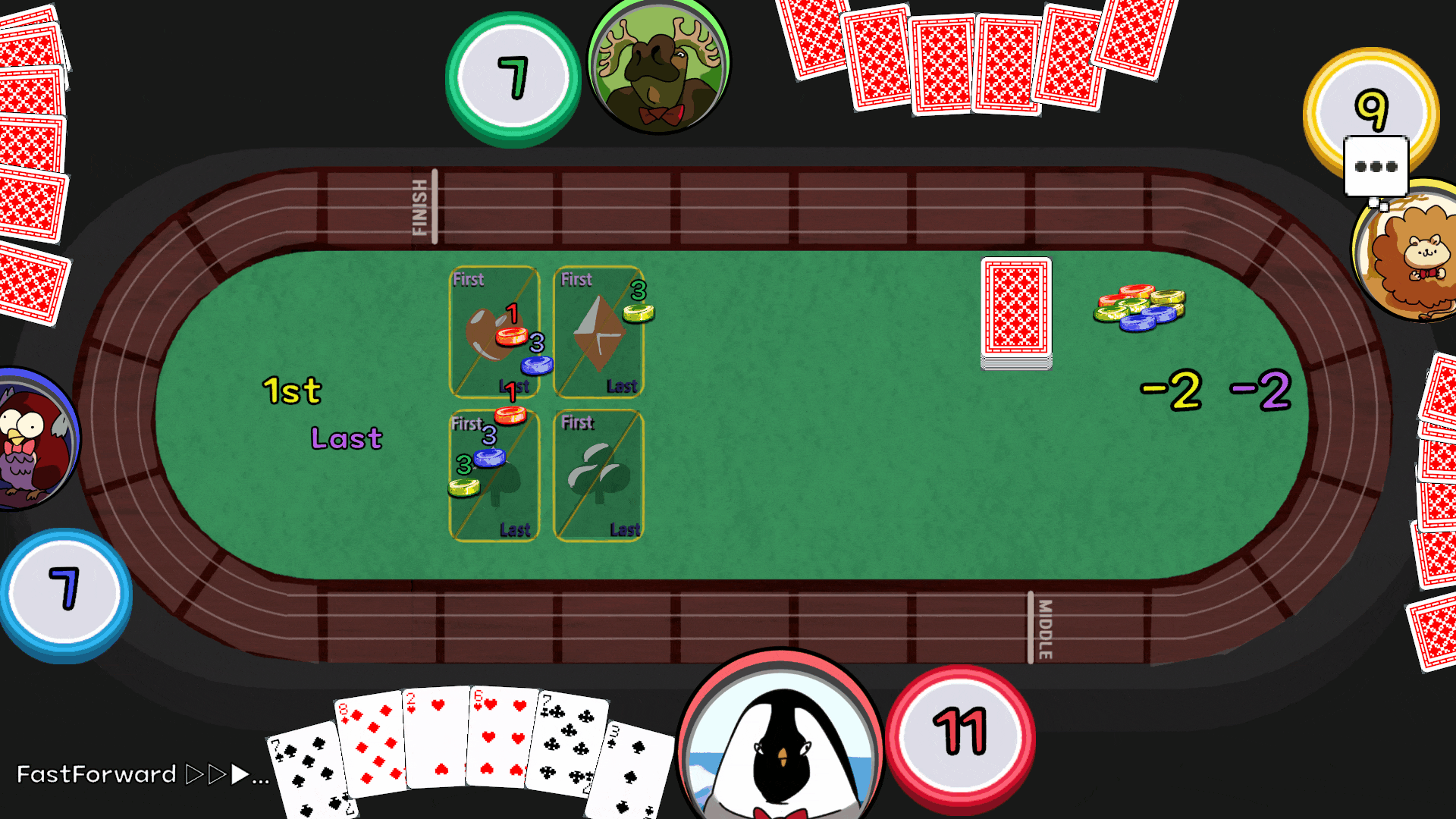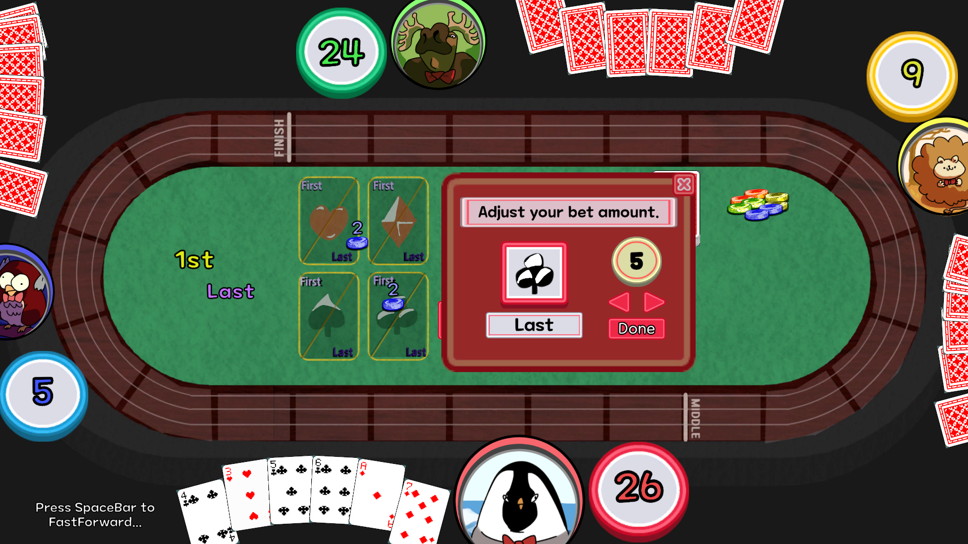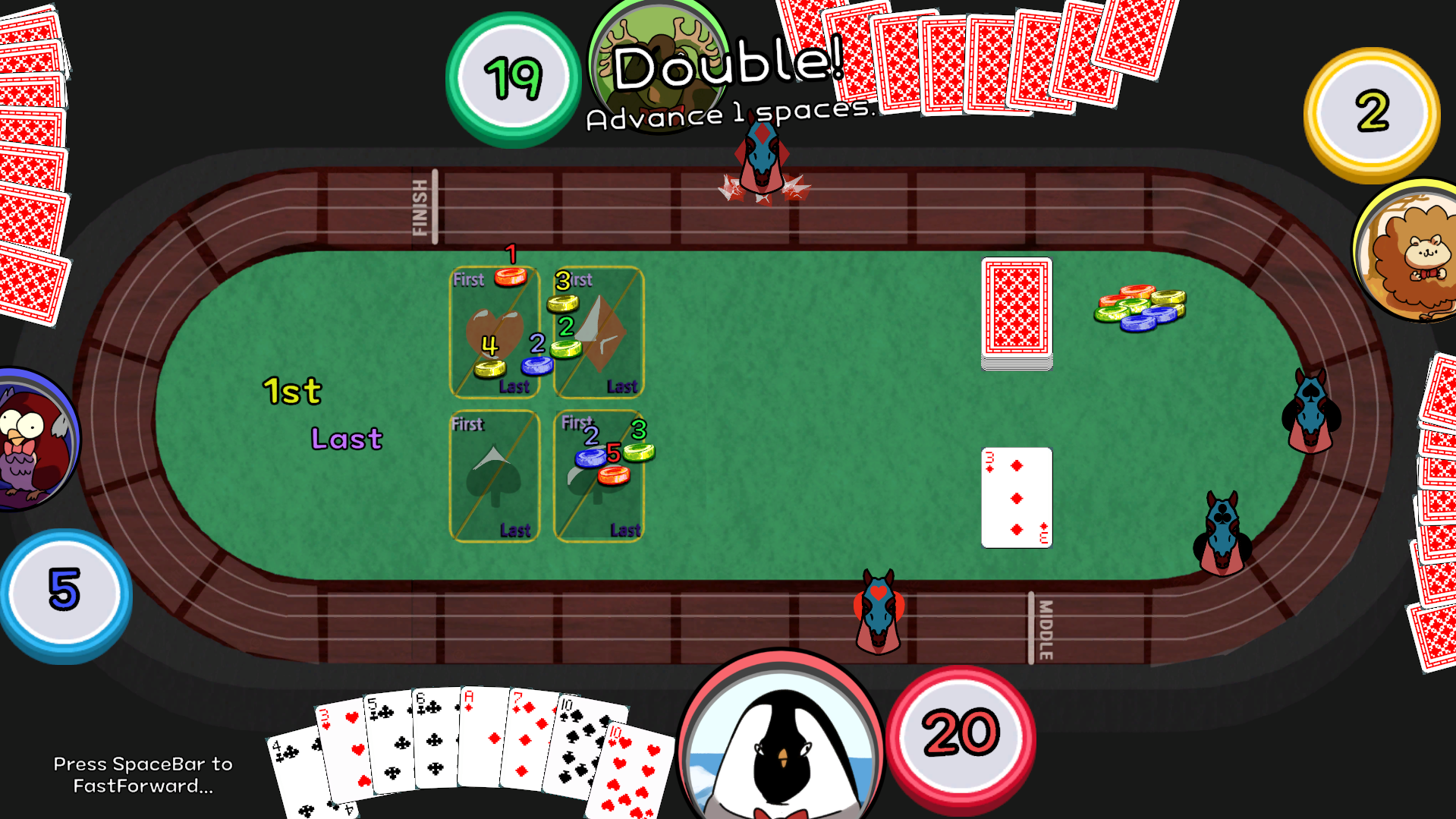 A card-based horse racing game where you bet on both the fastest and the slowest horse. Compete against three AI players to earn as many coins as possible!